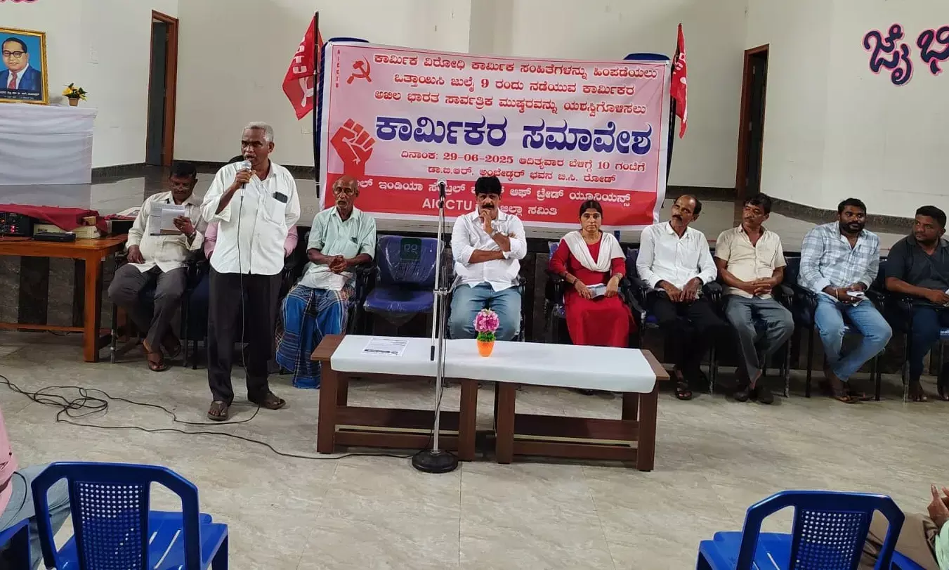 ಸಮಾವೇಶವನ್ನುದ್ದೇಶಿಸಿ ಮಾತನಾಡಿದ ಎಐಸಿಸಿಟಿಯು ರಾಜ್ಯಾಧ್ಯಕ್ಷ ಕಾಮ್ರೇಡ್ ಪಿ.ಪಿ ಅಪ್ಪಣ್ಣ ಮಾತನಾಡಿ ಕೇಂದ್ರದ ಬಿಜೆಪಿ ಸರಕಾರದ 11 ವರ್ಷಗಳ ಆಡಳಿತದಲ್ಲಿ ದುಡಿಯುವ ಜನರ ಸಂಕಷ್ಟಗಳು ಮಿತಿಮೀರಿದೆ. ದುಡಿಯುವ ಜನತೆಗೆ ಕನಿಷ್ಠ ಕೂಲಿ ಕೂಡಾ ಸಿಗದ ಪರಿಸ್ಥಿತಿ ನಿರ್ಮಾಣವಾಗಿದೆ. ಕಾರ್ಪೊರೇಟ್ ಧಣಿಗಳ ತಾಳಕ್ಕೆ ತಕ್ಕಂತೆ ಕುಣಿಯುತ್ತಿರುವ ಮೋದಿ ಸರಕಾರ ಕಾರ್ಮಿಕರ ಎಂಟು ಗಂಟೆಗಳ ಕೆಲಸದ ಹಕ್ಕನ್ನು ಕಿತ್ತುಹಾಕಿ ವಾರದಲ್ಲಿ ಎಪ್ಪತ್ತು ಗಂಟೆ ದುಡಿಯುವಂತೆ ಕಾಯ್ದೆಯ ತಿದ್ದುಪಡಿ ತರುವ ಮೂಲಕ ಕಾರ್ಮಿಕರ ಮೇಲೆ ದಾಳಿ ಮಾಡಿದೆ ಎಂದು ಆರೋಪಿಸಿದರು.