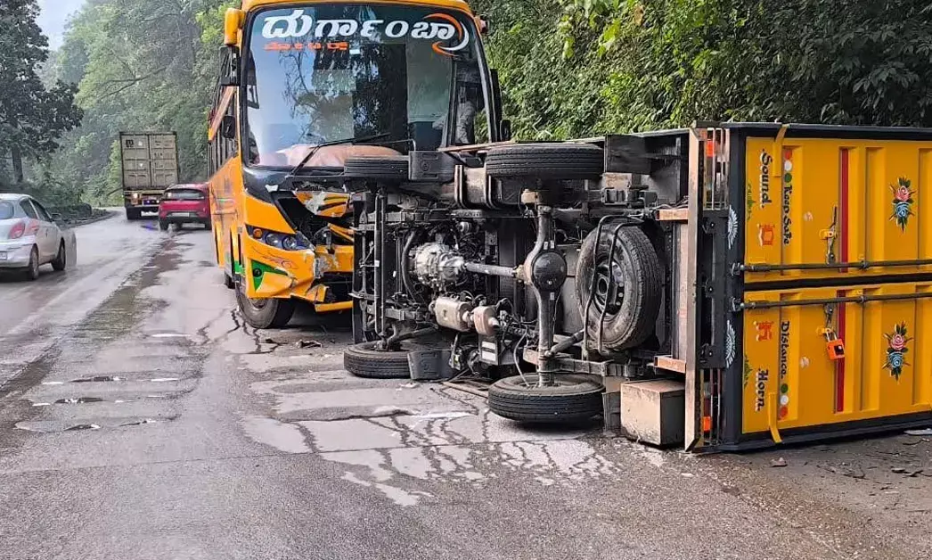 ಉಪ್ಪಿನಂಗಡಿ, ನ.28: ಚಾಲಕನ ನಿಯಂತ್ರಣ ತಪ್ಪಿದ ಗೂಡ್ಸ್ ಟೆಂಪೊವೊಂದು ಪಲ್ಟಿ ಹೊಡೆದು ಹೆದ್ದಾರಿಯ ಇನ್ನೊಂದು ಪಾರ್ಶ್ವದಲ್ಲಿ ಬರುತ್ತಿದ್ದ ಖಾಸಗಿ ಬಸ್ಸಿಗೆ ಢಿಕ್ಕಿ ಹೊಡೆದ ಘಟನೆ ಶುಕ್ರವಾರ ರಾ.ಹೆ. 75ರ ಶಿರಾಡಿ ಘಾಟ್ ಬಳಿಯ ಕೆಂಪುಹೊಳೆ ಎಂಬಲ್ಲಿ ನಡೆದಿದೆ.