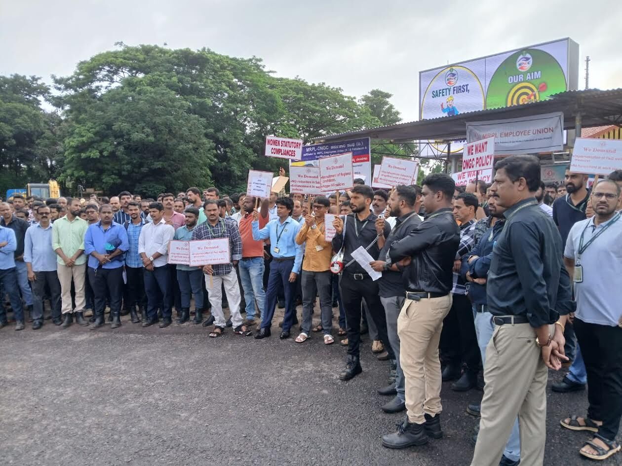 ಬೇಡಿಕೆ ಈಡೇರಿಕೆಗೆ ಆಗ್ರಹಿಸಿ ಎಂ.ಆರ್.ಪಿ.ಎಲ್. ಮುಖ್ಯ ದ್ವಾರದಲ್ಲಿ ಕಾರ್ಮಿಕರ ಮುಷ್ಕರ