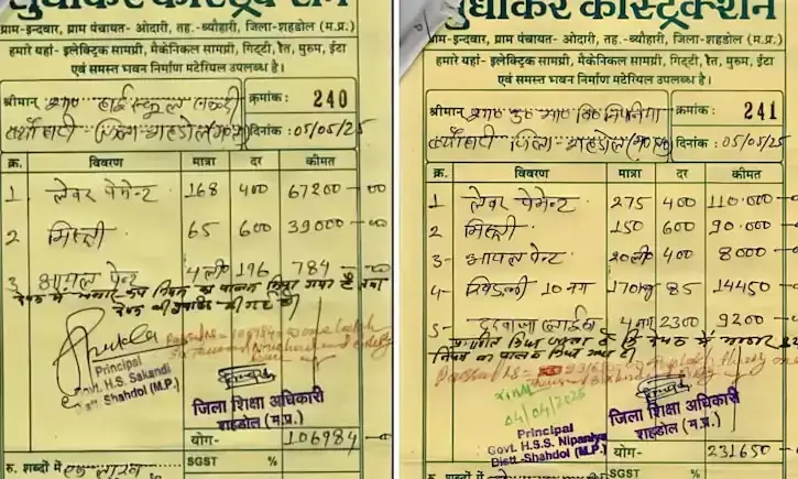 ಬ್ಯೋಹರಿ ಅಸೆಂಬ್ಲಿಯ ಈ ಬಿಲ್ ಶನಿವಾರ ಸಾಮಾಜಿಕ ಜಾಲತಾಣಗಲ್ಲಿ ವೈರಲ್ ಅಗಿದ್ದು, ಕೇವಲ ನಾಲ್ಕು ಲೀಟರ್ ಬಣ್ಣ ಹಚ್ಚಲು 1.07 ಲಕ್ಷ ರುಪಾಯಿಗಳನ್ನು ವೆಚ್ಚ ಮಾಡಿರುವ ಹಗರಣವನ್ನು ಬೆಳಕಿಗೆ ತಂದಿದೆ. ನಿಪನಿಯ ಗ್ರಾಮದ ಇನ್ನೊಂದು ಶಾಲೆಯಲ್ಲಿ 20 ಲೀಟರ್ ಪೆಯಿಂಟ್ ಮಾಡಲು 2.3 ಲಕ್ಷ ರೂಪಾಯಿ ವೆಚ್ಚ ಮಾಡಲಾಗಿದೆ.