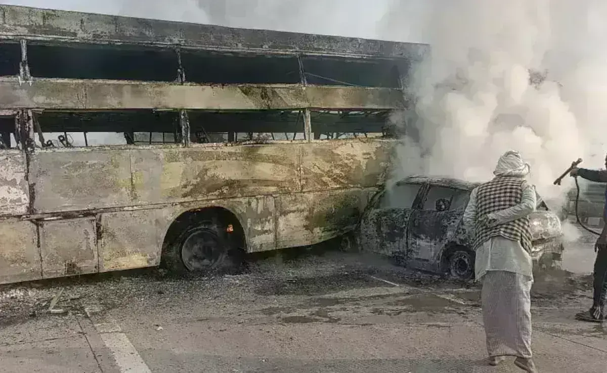 ಯಮುನಾ ಎಕ್ಸ್ಪ್ರೆಸ್ ವೇನಲ್ಲಿ ಬಸ್ಗೆ ಢಿಕ್ಕಿಯಾಗಿ ಹೊತ್ತಿ ಉರಿದ ಕಾರು: ಐವರು ಸಜೀಹ ದಹನ