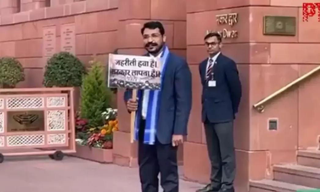 VIDEO | Parliament winter session: MP Chandrashekhar Azad protests inside Parliament premises over Delhi pollution, holding a banner reading, "Zehrili hawa hai, sarkar lapata hai."