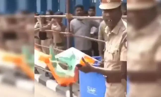 ಸಾಮಾಜಿಕ ಮಾಧ್ಯಮಗಳಲ್ಲಿ ವೈರಲ್ ಆಗಿರುವ ವಿಡಿಯೊದಲ್ಲಿ, ಕ್ರೀಡಾಂಗಣದಲ್ಲಿದ್ದ ಪ್ರೇಕ್ಷಕರು ರಾಷ್ಟ್ರ ಧ್ವಜವನ್ನು ಕಸದ ಡಬ್ಬಿಗೆ ಹಾಕಬೇಡಿ ಎಂದು ಹೇಳಿದ ನಂತರ ಸಬ್ ಇನ್ಸ್ ಪೆಕ್ಟರ್ ಆ ರಾಷ್ಟ್ರ ಧ್ವಜವನ್ನು ಕಸದ ಡಬ್ಬಿಯಿಂದ ಹೊರ ತೆಗೆಯುತ್ತಿರುವುದು ಕಂಡು ಬಂದಿದೆ. ಅವರು ರಾಷ್ಟ್ರ ಧ್ವಜಗಳನ್ನು ಕಸದ ಡಬ್ಬಿಗೆ ಹಾಕುತ್ತಿದ್ದರು ಹಾಗೂ ನೀವೇಕೆ ಹಾಗೆ ಮಾಡುತ್ತಿದ್ದೀರಿ ಎಂದು ನಾವು ಪ್ರಶ್ನಿಸಿದೆವು ಎಂದು ಪ್ರೇಕ್ಷಕರು ಹೇಳುತ್ತಿರುವುದು ಆ ವೈರಲ್ ವಿಡಿಯೊದಲ್ಲಿ ಸೆರೆಯಾಗಿದೆ.
