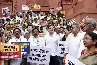 ಇಂಡಿಯಾ ಮೈತ್ರಿಕೂಟದ ನಾಯಕರಾದ ಮಲ್ಲಿಕಾರ್ಜುನ ಖರ್ಗೆ, ರಾಹುಲ್ ಗಾಂಧಿ, ಸಹಿತ ಸಂಸತ್ತಿನ ಎದುರು ಪ್ರತಿಭಟನೆ ನಡೆಸಿದರು.