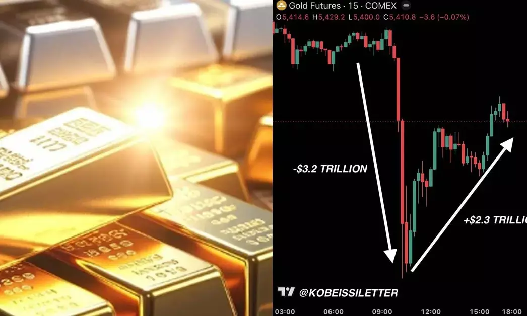 The Kobeissi Letter ಹೇಳಿರುವ ಪ್ರಕಾರ ಅಮೆರಿಕದ ಕಾಲಮಾನದಲ್ಲಿ ಗುರುವಾರ ಬೆಳಗ್ಗೆ 9.30 ಯಿಂದ 10.25 ನಡುವೆ (ಭಾರತೀಯ ಕಾಲಮಾನ ಸಂಜೆ 8 ಗಂಟೆಯಿಂದ 8.30 ನಡುವೆ) ಚಿನ್ನ 3.2 ಟ್ರಿಲಿಯನ್ ಡಾಲರ್ ಮಾರುಕಟ್ಟೆ ಬಂಡವಾಳವನ್ನು ಕಳೆದುಕೊಂಡಿದೆ. ಎಂದರೆ ಪ್ರತಿ ನಿಮಿಷಕ್ಕೆ 58 ಬಿಲಿಯನ್ ಡಾಲರ್! ಅದಾದ ಕೆಲವೇ ಸಮಯದಲ್ಲಿ ಟ್ರೆಂಡ್ ಹಿಮ್ಮುಖವಾಯಿತು. ಅಮೆರಿಕದ ಕಾಲಮಾನ ಬೆಳಿಗ್ಗೆ 10.25ರಿಂದ ಸಂಜೆ 4.00 ನಡುವೆ (ಬೆಳಿಗ್ಗೆ 10.40) ಮಾರುಕಟ್ಟೆ ಮುಕ್ತಾಯವಾದಾಗ ಚಿನ್ನವು 2.3 ಟ್ರಿಲಿಯನ್ ಡಾಲರ್ ಮೌಲ್ಯವನ್ನು ಮರಳಿ ಪಡೆದಿದೆ.