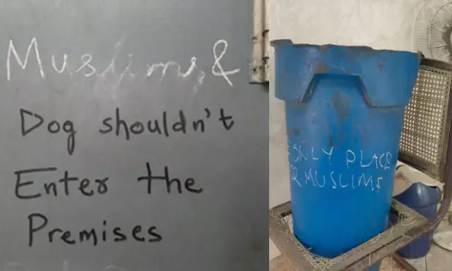 ಹಾಸ್ಟೆಲ್ನ ಎರಡನೇ ಮಹಡಿಯ ಮೂಲೆಯಲ್ಲಿರುವ ಕಸದ ಬುಟ್ಟಿಯ ಮೇಲೆ ‘ಇದು ಮುಸ್ಲಿಮರಿಗೆ ಏಕೈಕ ಸ್ಥಳ’ ಎಂದು ಬರೆಯಲಾಗಿದ್ದರೆ, ಹಾಸ್ಟೆಲ್ನ ಮೆಟ್ಟಿಲುಗಳ ರೇಲಿಂಗ್ನ್ನು ‘ನಾಯಿಗಳು ಮತ್ತು ಮುಸ್ಲಿಮರು ಬೇಡ’ ಎಂದು ಬರೆದು ವಿರೂಪಗೊಳಿಸಲಾಗಿದೆ.