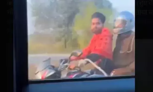 ಉತ್ತರಪ್ರದೇಶ: ಕೈಗೆ ಹಗ್ಗದಿಂದ ಕೈಕೋಳ ಹಾಕಿದ ವ್ಯಕ್ತಿಯೋರ್ವ ಬೈಕ್ ಚಲಾಯಿಸುತ್ತಿರುವುದು, ಪೊಲೀಸ್ ಪೇದೆಯೊಬ್ಬರು ಅವರ ಹಿಂದೆ ಸಹ ಸವಾರನಾಗಿ ಪ್ರಯಾಣಿಸುತ್ತಿರುವುದು ವೀಡಿಯೊವೊಂದರಲ್ಲಿ ಸೆರೆಯಾಗಿದೆ. ಉತ್ತರಪ್ರದೇಶದ ಮೈನ್ ಪುರಿಯಲ್ಲಿ ನಡೆದ ಘಟನೆ ಇದು ಎನ್ನಲಾಗಿದ್ದು, ಸಾಮಾಜಿಕ ಜಾಲತಾಣಗಳಲ್ಲಿ ವ್ಯಾಪಕವಾಗಿ ವೈರಲ್ ಆಗಿದೆ.