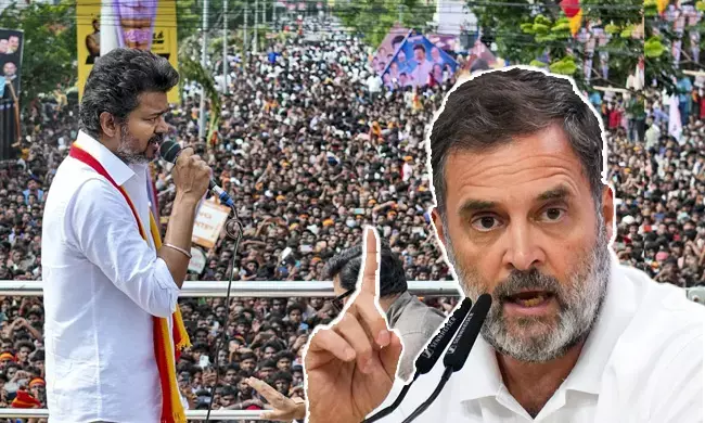 ಟಿವಿಕೆ ಅಧ್ಯಕ್ಷ ವಿಜಯ, ರಾಹುಲ್ ಗಾಂಧಿ | PTI