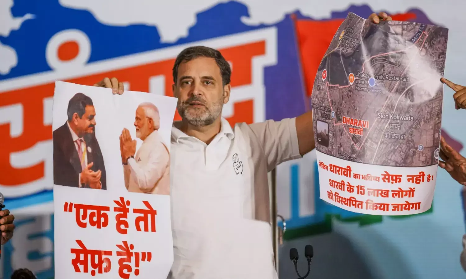 "ಏಕ್ ಹೈ ತೊ ಸೇಫ್ ಹೈ" (ಒಗ್ಗಟ್ಟಾಗಿದ್ದರೆ ಸುರಕ್ಷಿತವಾಗಿರುತ್ತೇವೆ) ಎಂಬ ನರೇಂದ್ರ ಮೋದಿ ಘೋಷಣೆ ಕುರಿತು ಪ್ರತಿಕ್ರಿಯಿಸಿದ ರಾಹುಲ್ ಗಾಂಧಿ, ಅದು ಅವರ ಸುರಕ್ಷತೆ ಎಂದು ವ್ಯಂಗ್ಯವಾಡಿದರು. ಇದೇ ಸಂದರ್ಭದಲ್ಲಿ ಧಾರಾವಿ ಕೊಳಗೇರಿ ಹಾಗೂ ಗೌತಮ್ ಅದಾನಿ ಮತ್ತು ನರೇಂದ್ರ ಮೋದಿಯ ಚಿತ್ರಗಳನ್ನು ತೆರೆದು ತೋರಿಸಿದ ಅವರು, “ಒಗ್ಗಟ್ಟಾಗಿದ್ದರೆ ಸುರಕ್ಷಿತವಾಗಿರುತ್ತೇವೆ ಎಂದು ಮೋದಿ ಹೇಳುವುದರ ಅರ್ಥ ಇದಾಗಿದೆ” ಎಂದು ಕುಟುಕಿದರು.