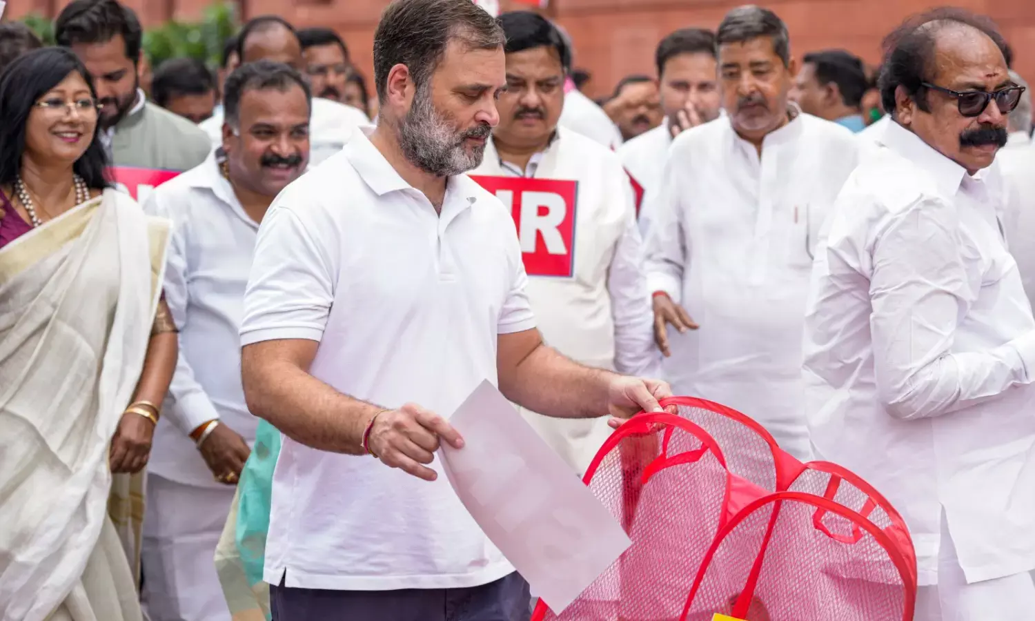 ಹೊಸದಿಲ್ಲಿ: ಮತದಾರರ ಪಟ್ಟಿಗಳ ವಿಶೇಷ ತೀವ್ರ ಪರಿಷ್ಕರಣೆ(SIR) ಎಂಬ ಭಿತ್ತಿಪತ್ರವನ್ನು ಹರಿದು ಕಸದ ಬುಟ್ಟಿಗೆ ಎಸೆಯುವ ಮೂಲಕ, ಬಿಹಾರದಲ್ಲಿ ನಡೆಯುತ್ತಿರುವ ವಿಶೇಷ ತೀವ್ರ ಮತಪಟ್ಟಿ ಪರಿಷ್ಕರಣೆ ಅಭಿಯಾನಕ್ಕೆ ವಿರೋಧಿಸಿ ಲೋಕಸಭಾ ವಿಪಕ್ಷ ನಾಯಕ ರಾಹುಲ್ ಗಾಂಧಿ, ಕಾಂಗ್ರೆಸ್ ಅಧ್ಯಕ್ಷ ಮಲ್ಲಿಕಾರ್ಜುನ ಖರ್ಗೆ ಸೇರಿದಂತೆ ಹಲವಾರು ಸಂಸದರು ಶುಕ್ರವಾರ ನೂತನ ಸಂಸತ್ ಭವನ ಸಂಕೀರ್ಣದೆದುರು ಸಾಂಕೇತಿಕವಾಗಿ ಪ್ರತಿಭಟನೆ ನಡೆಸಿದರು.