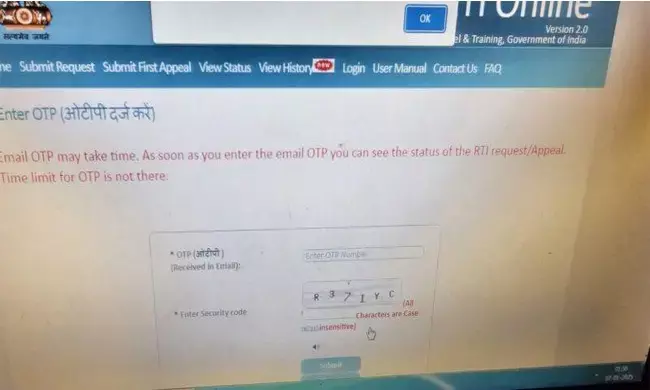 ಈಗ ಕಾಣಿಸಿಕೊಳ್ಳುವ ಪಾಪ್-ಅಪ್ ಸಂದೇಶವು ‘ಇಮೇಲ್ ಒಟಿಪಿ ಸಮಯವನ್ನು ತೆಗೆದುಕೊಳ್ಳಬಹುದು. ನೀವು ಇಮೇಲ್ ಒಟಿಪಿಯನ್ನು ನಮೂದಿಸಿದ ತಕ್ಷಣ ಆರ್ಟಿಐ ಮನವಿ/ಮೇಲ್ಮನವಿಯ ಸ್ಥಿತಿಗತಿಯನ್ನು ನೋಡಬಹುದು. ಒಟಿಪಿಗೆ ಸಮಯಮಿತಿ ಇಲ್ಲ’ ಎಂದು ಹೇಳುತ್ತದೆ.