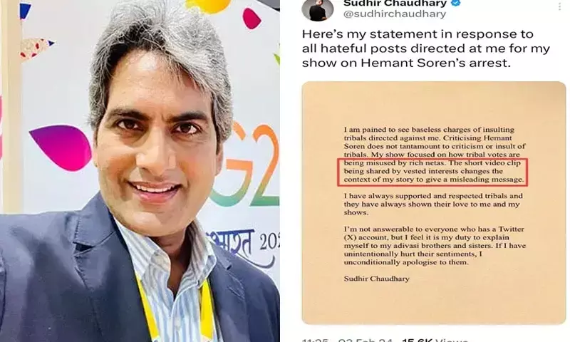 ಹೊಸದಿಲ್ಲಿ : ಜಾರ್ಖಂಡ್ ಮಾಜಿ ಮುಖ್ಯಮಂತ್ರಿ ಹೇಮಂತ್ ಸೊರೇನ್ ಅವರನ್ನು ಈಡಿ ಬಂಧಿಸುತ್ತಿದ್ದಂತೆ, ತಮ್ಮ ಕಾರ್ಯಕ್ರಮದಲ್ಲಿ ಹೇಮಂತ್ ಸೊರೇನ್ ಬಗ್ಗೆ ಮಾತಾಡುವಾಗ ಆದಿವಾಸಿಗಳ ಬಗ್ಗೆ ಕೀಳು ಮಟ್ಟದ ಹೇಳಿಕೆ ಕೊಟ್ಟಿದ್ದ ಆಂಕರ್ ಸುಧೀರ್ ಚೌಧರಿ ಕ್ಷಮೆಯಾಚಿಸಿದ್ದಾರೆ.