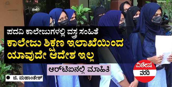 ‘ಇಲಾಖಾ ವ್ಯಾಪ್ತಿಗೊಳಪಡುವ ಸರಕಾರಿ ಪದವಿ ಕಾಲೇಜುಗಳಲ್ಲಿ ವಿದ್ಯಾರ್ಥಿಗಳಿಗೆ ವಸ್ತ್ರ ಸಂಹಿತೆಯ ಬಗ್ಗೆ ಇಲಾಖೆಯಿಂದ ಯಾವುದೇ ಆದೇಶ ಮತ್ತು ಸುತ್ತೋಲೆ ಹೊರಡಿಸಿರುವುದಿಲ್ಲ’ ಎಂಬ ಮಾಹಿತಿ ಒದಗಿಸಿದ್ದಾರೆ.