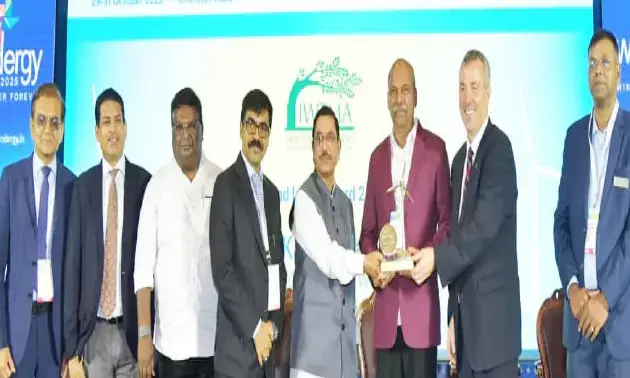 ವಿಂಡ್ ಟರ್ಬೈನ್ ತಯಾರಕರ ಸಂಘ(ಐಡಬ್ಲ್ಯುಟಿಎಂಎ) ಚೆನ್ನೈನ ಟ್ರೇಡ್ ಸೆಂಟರ್ನಲ್ಲಿ ಆಯೋಜಿಸಿದ್ದ ‘ವಿಂಡರ್ಜಿ ಇಂಡಿಯಾ 2025'ರ ಏಳನೆ ಆವೃತ್ತಿಯಲ್ಲಿ ಕೇಂದ್ರದ ನವೀಕರಿಸಬಹುದಾದ ಇಂಧನ ಸಚಿವ ಪ್ರಹ್ಲಾದ್ ಜೋಶಿಯವರಿಂದ ಕರ್ನಾಟಕ ನವೀಕರಿಸಬಹುದಾದ ಇಂಧನ ಅಭಿವೃದ್ಧಿ ನಿಯಮಿತದ ಅಧ್ಯಕ್ಷರೂ ಆದ ಶಾಸಕ ಟಿ.ಡಿ.ರಾಜೇಗೌಡ ಮತ್ತು ಕ್ರೆಡಲ್ನ ವ್ಯವಸ್ಥಾಪಕ ನಿರ್ದೇಶಕ ಕೆ.ಪಿ.ರುದ್ರಪ್ಪಯ್ಯ ಪ್ರಶಸ್ತಿ ಸ್ವೀಕಾರ ಮಾಡಿದರು.