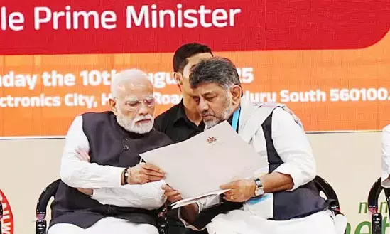 ರವಿವಾರ ಎಲೆಕ್ಟ್ರಾನಿಕ್ ಸಿಟಿಯ ಐಐಐಟಿ ಆಡಿಟೋರಿಯಂನಲ್ಲಿ ಏರ್ಪಡಿಸಿದ್ದ ಮೆಟ್ರೋ ರೈಲು ಹಳದಿ ಮಾರ್ಗ ಉದ್ಘಾಟನೆ ಸಮಾರಂಭದ ವೇದಿಕೆ ಮೇಲೆ ಪ್ರಧಾನಿಗೆ ಡಿ.ಕೆ.ಶಿವಕುಮಾರ್ ಮನವಿ ಸಲ್ಲಿಸಿದರು.