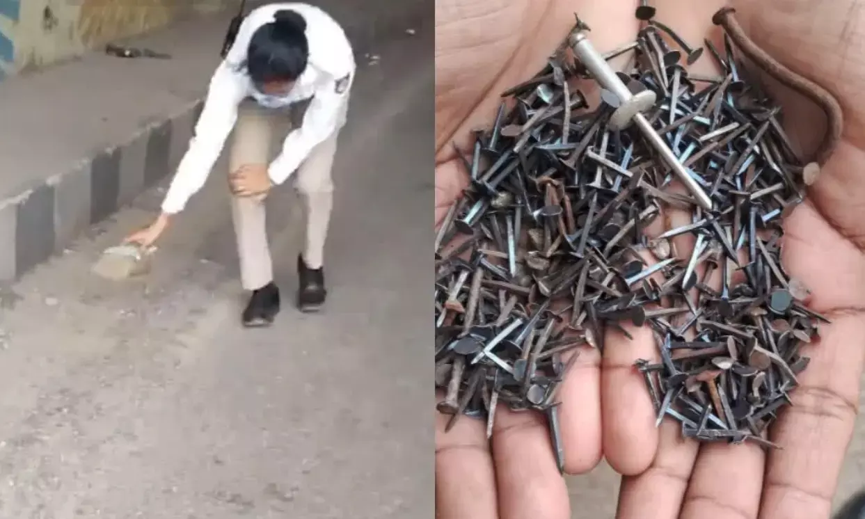 ಬೆಂಗಳೂರು | ರಸ್ತೆಯಲ್ಲಿ ರಾಶಿ ಮೊಳೆಗಳು ಪತ್ತೆ: ಹೆಕ್ಕಿ ತೆಗೆದ ಟ್ರಾಫಿಕ್ ಪೊಲೀಸ್!
