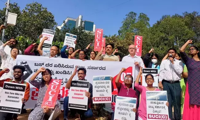 ಬಸ್ ಪ್ರಯಾಣ ದರ ಏರಿಕೆಯನ್ನು ಖಂಡಿಸಿ, ರವಿವಾರ ನಗರದ ಸ್ವಾತಂತ್ರ್ಯ ಉದ್ಯಾನವನದಲ್ಲಿ ಸೋಷಲಿಸ್ಟ್ ಯೂನಿಟಿ ಸೆಂಟರ್ ಆಫ್ ಇಂಡಿಯಾ (ಕಮ್ಯೂನಿಸ್ಟ್) ಪಕ್ಷದ ವತಿಯಿಂದ ಆಯೋಜಿಸಿದ್ದ ಪ್ರತಿಭಟನೆಯಲ್ಲಿ ಮಾತನಾಡಿದ ಅವರು,