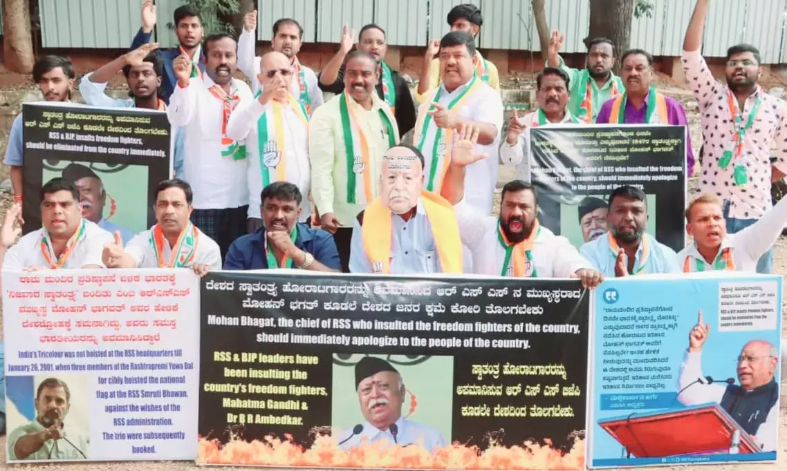 ದೇಶದ ಸ್ವಾತಂತ್ರ್ಯ ಹೋರಾಟಗಾರರನ್ನು ಹಾಗೂ ಸ್ವಾತಂತ್ರ್ಯಕ್ಕಾಗಿ ಮಡಿದ ಯೋಧರನ್ನು ಅಪಮಾನಿಸಿರುವ ಆರೆಸ್ಸೆಸ್ ಸಂಸ್ಥೆಯ ಮುಖ್ಯಸ್ಥ ಮೋಹನ್ ಭಾಗವತ್ ಈ ಕೂಡಲೇ ದೇಶದ ಜನತೆಗೆ ಕ್ಷಮೆ ಕೋರಿ, ಭಾರತದಿಂದ ತೋಲಗಬೇಕು ಎಂದು ಎಸ್.ಮನೋಹರ್ ಆಗ್ರಹಿಸಿದರು. ಕಾಂಗ್ರೆಸ್ ಮುಖಂಡರಾದ ಎ.ಆನಂದ್, ಪ್ರಕಾಶ್, ಹೇಮರಾಜ್, ಕೆ.ಟಿ.ನವೀನ್ ಚಂದ್ರ, ಓಬಳೇಶ್, ಚಿನ್ನಿ ಪ್ರಕಾಶ್, ಚಂದ್ರಶೇಖರ, ಉಮೇಶ್, ರಂಜಿತ್, ಸುಂಕದಕಟ್ಟೆ ನವೀನ್, ಕುಶಾಲ್ ಹರುವೆ ಗೌಡ, ಪುಟ್ಟರಾಜು, ನವೀನ್ ಸಾಯಿ ಸೇರಿದಂತೆ ಹಲವರು ಭಾಗವಹಿಸಿದ್ದರು.