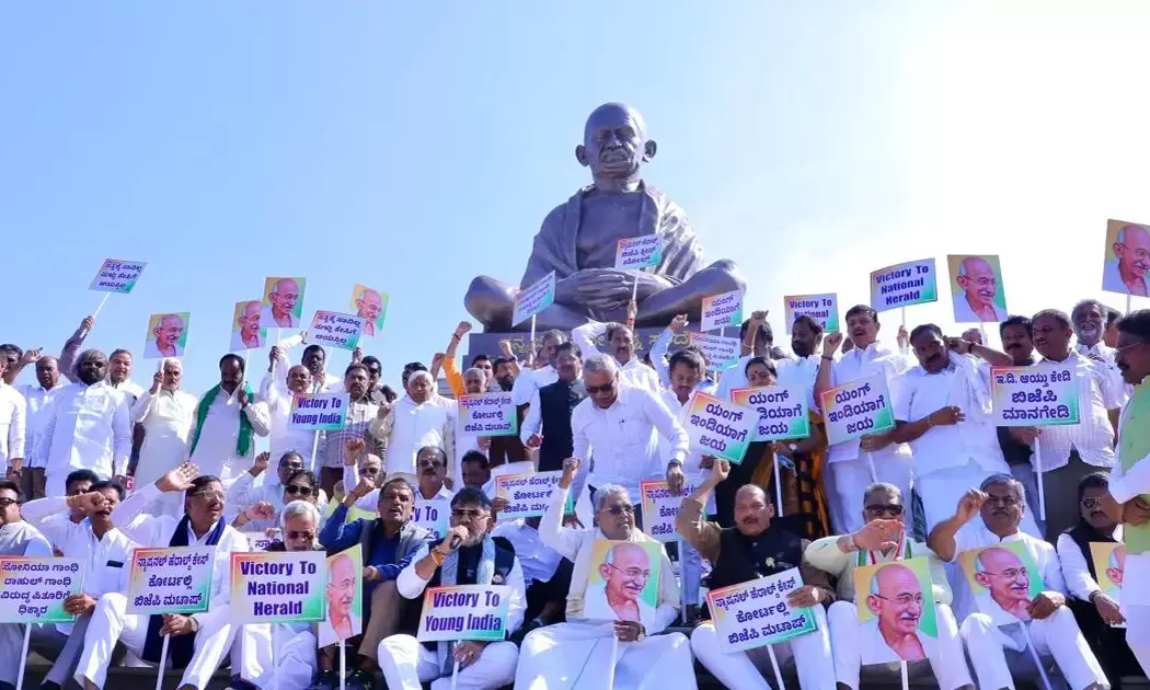 ಕೇಂದ್ರದ ದ್ವೇಷ ರಾಜಕಾರಣ ಖಂಡಿಸಿ ಕಾಂಗ್ರೆಸ್ನಿಂದ ಸುವರ್ಣಸೌಧದ ಗಾಂಧಿ ಪ್ರತಿಮೆ ಎದುರು ಪ್ರತಿಭಟನೆ