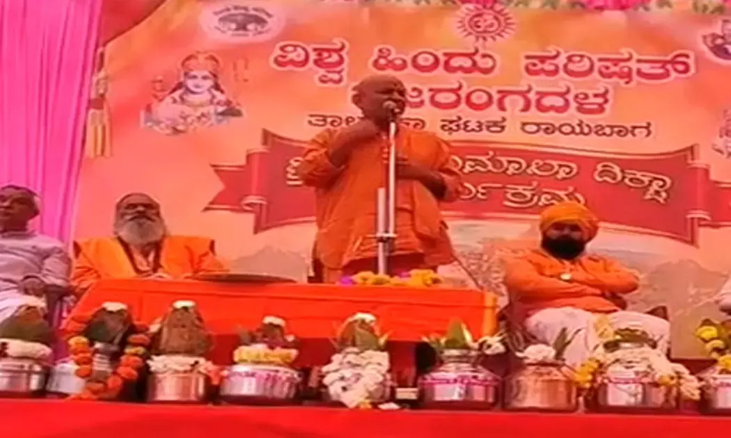 ಬೆಳಗಾವಿ : ಮಹಾರಾಷ್ಟ್ರದ ಕನ್ನೇರಿ ಮಠದ ಅದೃಶ್ಯ ಕಾಡಸಿದ್ದೇಶ್ವರ ಸ್ವಾಮೀಜಿ ಮತ್ತೆ ವಿವಾದಾತ್ಮಕ ಹೇಳಿಕೆ ನೀಡಿದ್ದಾರೆ. ಇಂದು(ಡಿ.1) ಬೆಳಗಾವಿ ಜಿಲ್ಲೆಯ ರಾಯಬಾಗ ಪಟ್ಟಣದಲ್ಲಿ ವಿಶ್ವ ಹಿಂದೂ ಪರಿಷತ್ ಹಾಗೂ ಬಜರಂಗದಳ ಘಟಕದ ವತಿಯಿಂದ ಆಯೋಜಿಸಿದ್ದ ಹನುಮ ಮಾಲೆ ಧೀಕ್ಷಾ ಕಾರ್ಯಕ್ರಮದಲ್ಲಿ ಸ್ವಾಮೀಜಿ ನೀಡಿದ ಹೇಳಿಕೆ ವಿವಾದಕ್ಕೆ ಕಾರಣವಾಗಿದೆ.