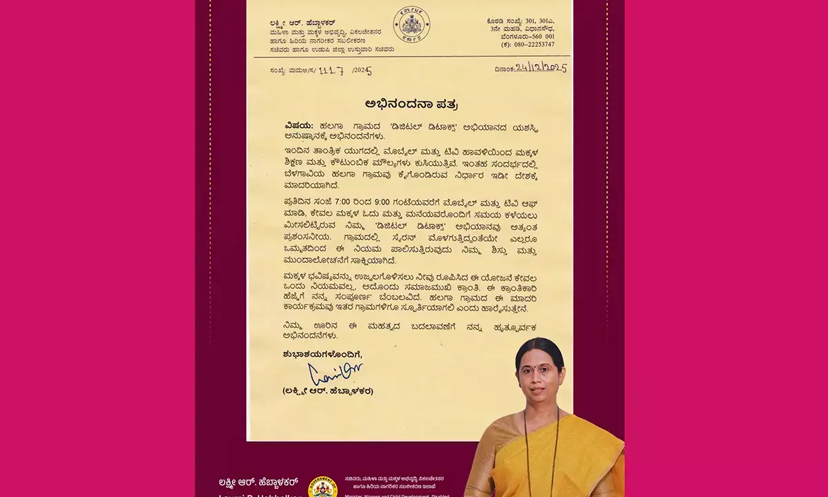 ಬೆಳಗಾವಿ: ಹಲಗಾ ಗ್ರಾಮದಲ್ಲಿ ಜಾರಿಗೆ ತಂದಿರುವ 'ಡಿಜಿಟಲ್ ಡಿಟಾಕ್ಸ್' ಅಭಿಯಾನಕ್ಕೆ ಕ್ಷೇತ್ರದ ಶಾಸಕರೂ ಆಗಿರುವ ಮಹಿಳಾ ಮತ್ತು ಮಕ್ಕಳ ಅಭಿವೃದ್ಧಿ ಸಚಿವೆ ಲಕ್ಷ್ಮೀ ಹೆಬ್ಬಾಳ್ಕರ್ ಪ್ರಶಂಸೆ ವ್ಯಕ್ತಪಡಿಸಿ ಅಭಿನಂದನಾ ಪತ್ರ ಕಳುಹಿಸಿದ್ದಾರೆ.