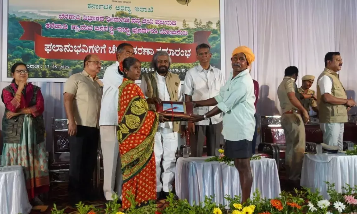 ಶನಿವಾರ ಬೆಳಗಾವಿ ಜಿಲ್ಲೆಯ ಖಾನಾಪುರ ತಾಲೂಕಿನ ಹೆಮ್ಮಡಗಾದಲ್ಲಿ ಭೀಮಗಢ ಅರಣ್ಯ ವಲಯದ ತಳೇವಾಡಿ (ಗೌವಳಿ) ಗ್ರಾಮದಿಂದ ಸ್ವಯಂ ಪ್ರೇರಿತವಾಗಿ ಕಾಡಿನಿಂದ ಹೊರಗೆ ಬರಲು ಇಚ್ಛಿಸಿರುವ 27 ಕುಟುಂಬಗಳಿಗೆ ಚೆಕ್ ವಿತರಿಸಿ ಅವರು ಮಾತನಾಡಿದರು.