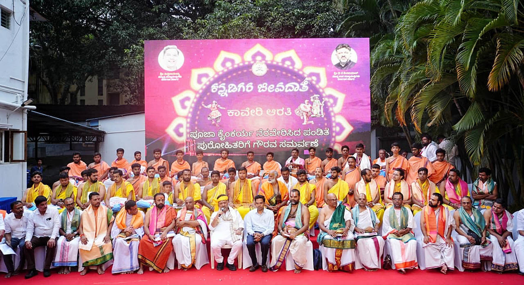 ಬೆಂಗಳೂರು: ಇದೇ ಮೊದಲ ಬಾರಿಗೆ ವಾರಣಾಸಿಯ ಗಂಗಾ ಆರತಿ ಮಾದರಿಯಲ್ಲಿ ದಕ್ಷಿಣ ಭಾರತದಲ್ಲಿ ಮೊದಲ ಬಾರಿಗೆ ಮಂಡ್ಯ ಜಿಲ್ಲೆ ಕೆಆರ್ಎಸ್ನಲ್ಲಿ ಐತಿಹಾಸಿಕ ‘ಕಾವೇರಿ ಆರತಿ’ಯನ್ನು ಅಭೂತಪೂರ್ಣವಾಗಿ ನೆರವೇರಿಸಿದ ಪಂಡಿತ, ಪುರೋಹಿತರಿಗೆ ಉಪಮುಖ್ಯಮಂತ್ರಿ ಡಿ.ಕೆ.ಶಿವಕುಮಾರ್ ಅವರು ಸನ್ಮಾನಿಸಿದರು.