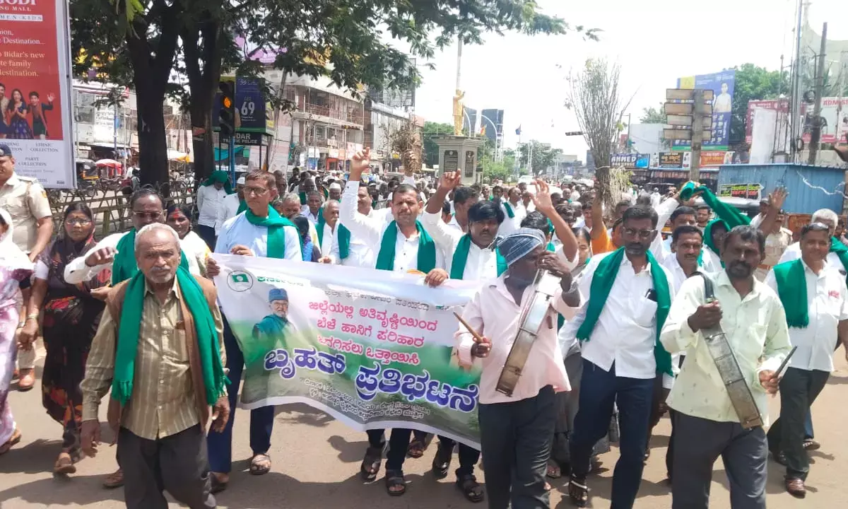 ಇಂದು ನಗರದ ಅಂಬೇಡ್ಕರ್ ವೃತ್ತದಲ್ಲಿ ರೈತರು ಅತಿವೃಷ್ಟಿಯಿಂದ ಹಾಳಾಗಿದ್ದ ಬೆಳೆ ತಂದು ಪರಿಹಾರಕ್ಕಾಗಿ ಘೋಷಣೆ ಕೂಗಿದರು. ನಂತರ ಅಂಬೇಡ್ಕರ್ ವೃತ್ತದಿಂದ ಜಿಲ್ಲಾಧಿಕಾರಿ ಕಚೇರಿ ವರೆಗೆ ಪ್ರತಿಭಟನಾ ಮೆರವಣಿಗೆ ಮೂಲಕ ಸಾಗಿದರು.
