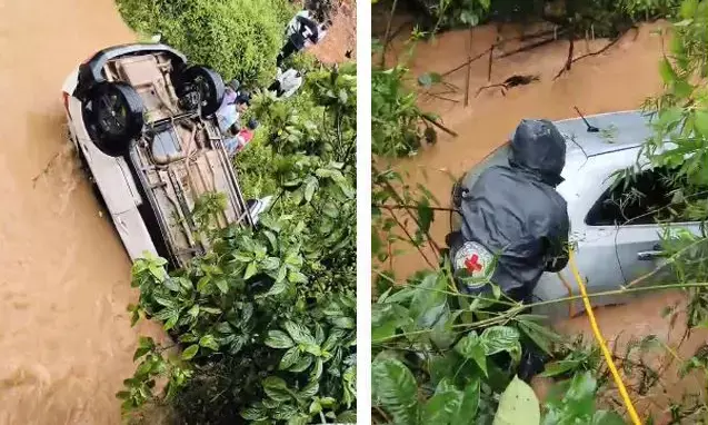ಮೂಡಿಗೆರೆ | ಧಾರಾಕಾರ ಮಳೆ: ಒಂದು ಗಂಟೆ ಅಂತರದಲ್ಲಿ ನದಿಗೆ ಬಿದ್ದ ಎರಡು ಕಾರುಗಳು