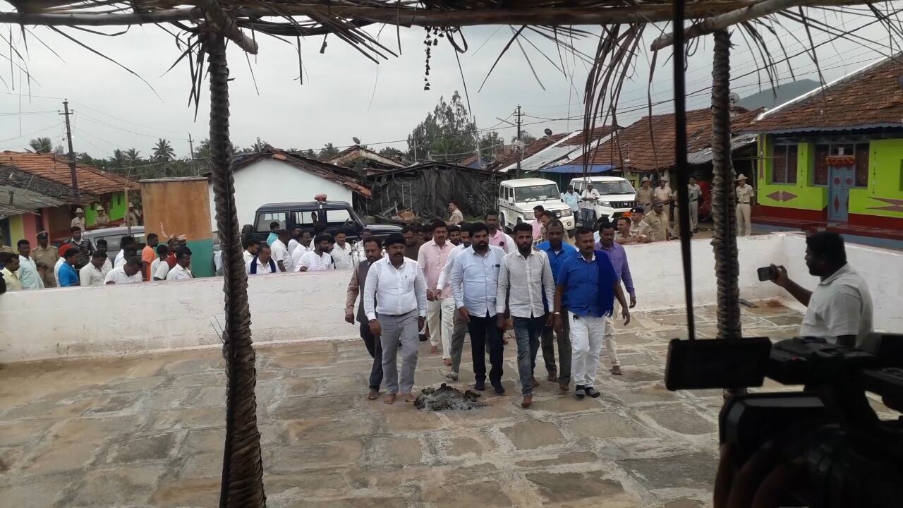 ಈ ವೇಳೆ ಗ್ರಾಮದಲ್ಲಿದ್ದ ದೇಗುಲಕ್ಕೆ ಬೀಗ ಹಾಕಿದ್ದು ಕಂಡು ಬಂತು. ಅಧಿಕಾರಿಗಳು ಬೀಗ ತೆರೆಯುವಂತೆ ಗ್ರಾಮದ ಹಿರಿಯ ಮುಖಂಡರ ಮನವೊಲಿಸಲು ಪ್ರಯತ್ನಿಸಿದರು. ಆದರೆ ಮುಖಂಡರು, ದೇವಸ್ಥಾನದ ಅರ್ಚಕ ಪರಿಶಿಷ್ಟ ಜಾತಿ ಯುವಕನ ಮೇಲೆ ಹಲ್ಲೆ ಪ್ರಕರಣದಲ್ಲಿ ಆರೋಪಿಯಾಗಿದ್ದು, ಆತ ತಲೆಮರೆಸಿ ಕೊಂಡಿರುವ ಹಿನ್ನೆಲೆಯಲ್ಲಿ ದೇವಸ್ಥಾನದ ಬೀಗ ನಮ್ಮ ಬಳಿ ಇಲ್ಲ ಎಂದು ಪ್ರತಿಕ್ರಿಯಿಸಿದರು. ಈ ವೇಳೆ ತಹಶೀಲ್ದಾರ್ ರಾಜೀವ್, ಬೀಗ ತೆರೆಯುವವರನನು ಕರೆಸಿ ದೇವಸ್ಥಾನದ ಬೀಗ ಒಡೆದು ದೇಗುವ ಪ್ರವೇಶಿಸಿದರು. ದೇಗುಲದ ಗರ್ಭಗುಡಿಯ ಬಾಗಿಲಿಗೂ ಬೀಗ ಹಾಕಿದ್ದರಿಂದ ಅಧಿಕಾರಿಗಳು ಅದನ್ನೂ ಒಡೆದು ಬಾಗಿಲು ತೆರೆದರು. ಈ ವೇಳೆ ರಾಜ್ಯ ಮಟ್ಟದ ದಲಿತ ಮುಖಂಡರ ನೇತೃತ್ವದಲ್ಲಿ ಗ್ರಾಮ ಪ್ರವೇಶಿಸಿದ್ದ ಮಾದಿ ಸಮುದಾಯದ ನೂರಾರು ಜನರು ಅಧಿಕಾರಿಗಳೊಂದಿಗೆ ದೇಗುವ ಪ್ರವೇಶಿಸಿದ ದೇವರಿಗೆ ಪೂಜೆ ಸಲ್ಲಿಸಿದರು. ಈ ವೇಳೆ ಗ್ರಾಮಸ್ಥರಿಂದ ಹಲ್ಲೆಗೊಳಗಾಗಿದ್ದ ದಲಿತ ಯುವಕ ಮಾರುತಿ ಕೂಡ ದೇಗುಲ ಪ್ರವೇಶಿಸಿದ್ದರು.