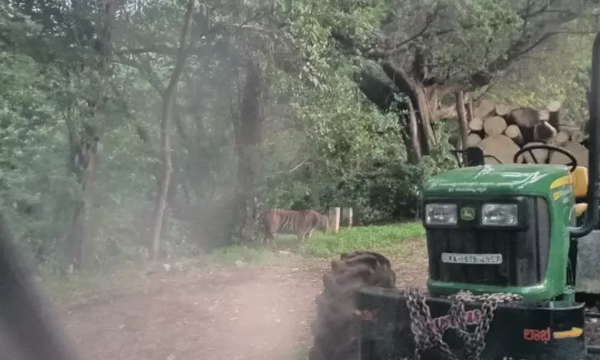 ಶುಕ್ರವಾರ ಮುಂಜಾನೆ ಹಿರೇಕೊಳಲೆ ಚನ್ನಗೊಂಡನಹಳ್ಳಿಯಿಂದ ಬಾಗುಮನೆ ಕಾಫಿ ಎಸ್ಟೇಟ್ಗೆ ರಸ್ತೆ ಬದಿಯಲ್ಲಿ ಹುಲಿ ಕಾಣಿಸಿಕೊಂಡಿದ್ದು, ರಸ್ತೆಯಲ್ಲಿ ಟ್ರ್ಯಾಕ್ಟರ್ ಚಲಾಯಿಸಿಕೊಂಡು ಹೋಗುತ್ತಿದ್ದ ಚಾಲಕ ಹುಲಿಯನ್ನು ಕಂಡು ಹೆದರಿಕೊಂಡಿದ್ದು, ಟ್ರ್ಯಾಕ್ಟರ್ ಅನ್ನು ಸ್ಥಳದಲ್ಲೇ ನಿಲ್ಲಿಸಿ ಹಿಂದೆಯೇ ಬಂದ ಕಾರೊಂದರಲ್ಲಿ ಹೋಗಿದ್ದಾನೆ. ಅದೇ ವೇಳೆಗೆ ಮುಂಭಾಗದಿಂದ ಜೀಪ್ನಲ್ಲಿ ಬರುತ್ತಿದ್ದ ವ್ಯಕ್ತಿಯೊಬ್ಬರು ತಮ್ಮ ಮೊಬೈಲ್ನಲ್ಲಿ ಹುಲಿಯ ಚಿತ್ರವನ್ನು ಸೆರೆ ಹಿಡಿದುಕೊಂಡಿದ್ದಾರೆ.
