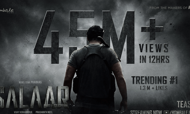 ಹೈದರಾಬಾದ್: ಕೆಜಿಎಫ್ ಖ್ಯಾತಿಯ ಪ್ರಶಾಂತ್ ನೀಲ್ ನಿರ್ದೇಶನದ ನಟ ಪ್ರಭಾಸ್ ಅಭಿನಯದ ಬಹುನಿರೀಕ್ಷಿತ 'ಸಲಾರ್' ಸಿನೆಮಾದ ಟೀಸರ್ ಬಿಡುಗಡೆಯಾಗಿದ್ದು, ಕೇವಲ 12 ಗಂಟೆಗಳಲ್ಲಿ 45 ಮಿಲಿಯನ್ಗಿಂತಲೂ ಅಧಿಕ ವೀಕ್ಷಣೆಯಾಗಿದೆ.