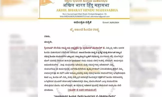 ಬೆಂಗಳೂರು: "ಹಿಂದೂ ರಾಷ್ಟ್ರ ನಿರ್ಮಿಸುವ ಹಾಗೂ ಹಿಂದೂಗಳನ್ನು ಸೈನಿಕೀಕರಣಗೊಳಿಸುವ" ಪ್ರತಿಜ್ಞೆ ಕೈಗೊಳ್ಳಲೆಂದು ಅಖಿಲ ಭಾರತ ಹಿಂದೂ ಮಹಾಸಭಾವು ಜೂನ್ 16ರಂದು ಮಂಗಳೂರಿನ ಕದ್ರಿ ಯೋಗೇಶ್ವರ ಮಠದಲ್ಲಿ ಸಭೆಯೊಂದನ್ನು ಆಯೋಜಿಸಿದೆ ಎನ್ನಲಾಗಿದ್ದು, ಇದರ ಆಹ್ವಾನ ಪತ್ರ ಸಾಮಾಜಿಕ ಜಾಲತಾಣದಲ್ಲಿ ವೈರಲ್ ಆಗಿದೆ.