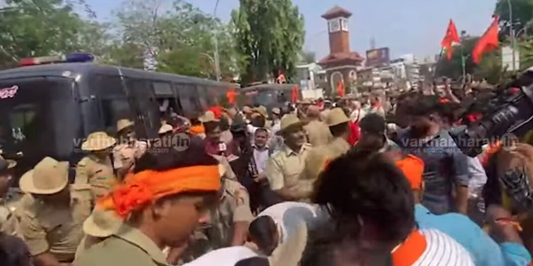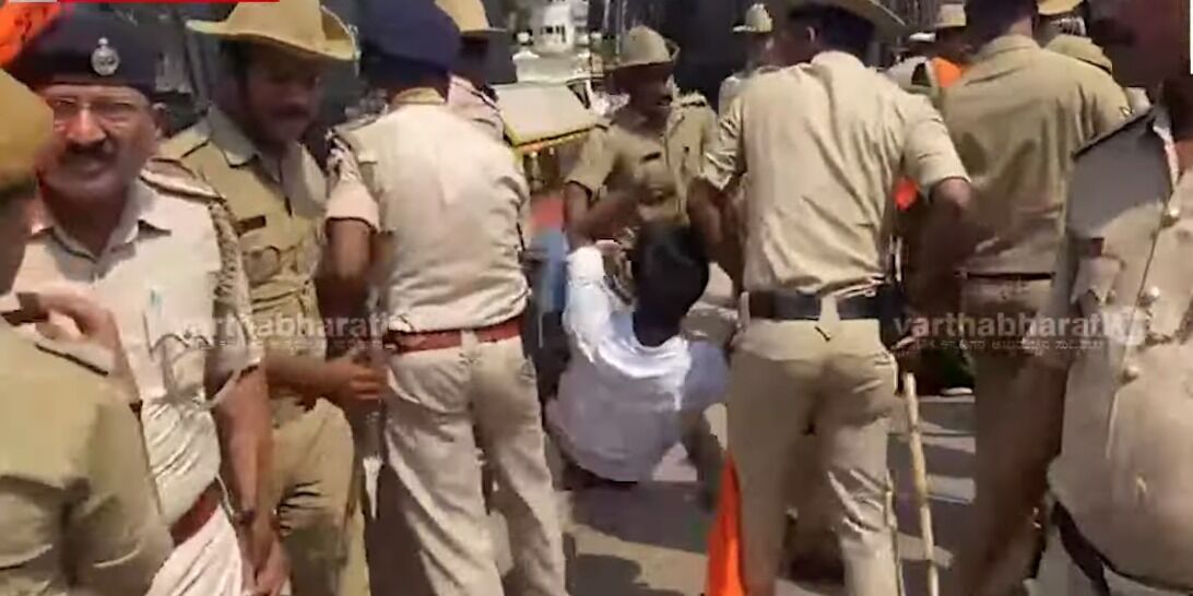 ಪೊಲೀಸ್ ಆಯುಕ್ತರಿಗೆ ಮನವಿ ನೀಡಲು ಅವಕಾಶ ನೀಡಬೇಕು. ನೀಡದಿದರೂ ಮೆರವಣಿಗೆಯಲ್ಲಿ ಹೋಗುತ್ತೇವೆ ಎಂದು ಪ್ರತಿಭಟನಾಕಾರರು ಪೊಲೀಸರು ಹಾಕಿದ್ದ ಬ್ಯಾರಿಕೇಡ್ ತಳ್ಳಿ ‘ಜೈ ಶ್ರೀರಾಮ್’ ಎಂದು ಘೋಷಣೆ ಕೂಗುತ್ತಾ ಮುನ್ನುಗ್ಗಲು ಪ್ರಯತ್ನಿಸಿದರು. ಈ ಸಂದರ್ಭ ಸ್ಥಳದಲ್ಲಿದ್ದ ಡಿಸಿಪಿ ಸಿದ್ಧಾರ್ಥ್ ಗೋಯಲ್ ಅವರು, ಪ್ರತಿಭಟನಾಕಾರರನ್ನು ವಶಕ್ಕೆ ಪಡೆದು ಪೊಲೀಸ್ ವಾಹನದಲ್ಲಿ ಕಳುಹಿಸಿದರು.