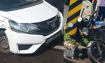 ಉಡುಪಿ ಕಡೆಯಿಂದ ಮಂಗಳೂರು ಕಡೆಗೆ ಹೋಗುತ್ತಿದ್ದ ಬೈಕ್ ಗೆ ಮುಲ್ಕಿ ರಾಷ್ಟ್ರೀಯ ಹೆದ್ದಾರಿ ವಿಜಯ ಸನ್ನಿಧಿ ಜಂಕ್ಷನ್ ಬಳಿ ಕಿನ್ನಿಗೋಳಿ ಕಡೆಯಿಂದ ಮುಲ್ಕಿ ಕಡೆಗೆ ಹೆದ್ದಾರಿ ಕ್ರಾಸ್ ಮಾಡುತ್ತಿದ್ದ ಕಾರು ಢಿಕ್ಕಿ ಹೊಡೆದಿದೆ.