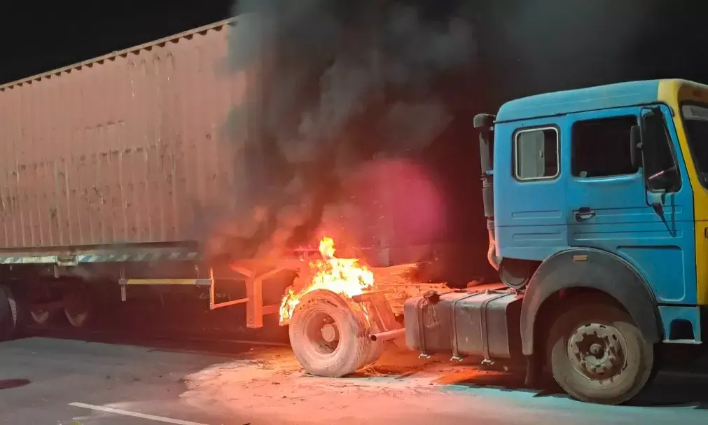 ಪಡುಬಿದ್ರೆ ನಂದಿಕೂರು ಕೈಗಾರಿಕಾ ಪ್ರದೇಶದ ಬ್ರೈಟ್ ಫ್ಲೆಕ್ಸ್ ಕಂಪನಿಯಿಂದ ಮಂಗಳೂರು ಬಂದರ್ ಕಡೆಗೆ ಪ್ಲಾಸ್ಟಿಕ್ ವಸ್ತುಗಳನ್ನು ಸಾಗಾಟ ಮಾಡುತ್ತಿದ್ದ ಕಂಟೈನರ್ ಬಪ್ಪನಾಡು ಸೇತುವೆ ತಲುಪುತ್ತಿದ್ದಂತೆ ಬ್ರೇಕ್ ಲೈನರ್ ಜಾಮ್ ಆಗಿ ಟಯರ್ ಮೇಲ್ಗಡೆ ಹೊತ್ತಿ ಉರಿದಿದೆ.