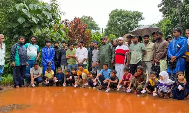 ಮಕ್ಕಳಿಗೆ ದೋಣಿ ಸ್ಪರ್ಧೆ ಏರ್ಪಡಿಸುವ ಮೂಲಕ ರಸ್ತೆ ದುರವಸ್ಥೆ ವಿರುದ್ಧ ಪ್ರತಿಭಟನೆ