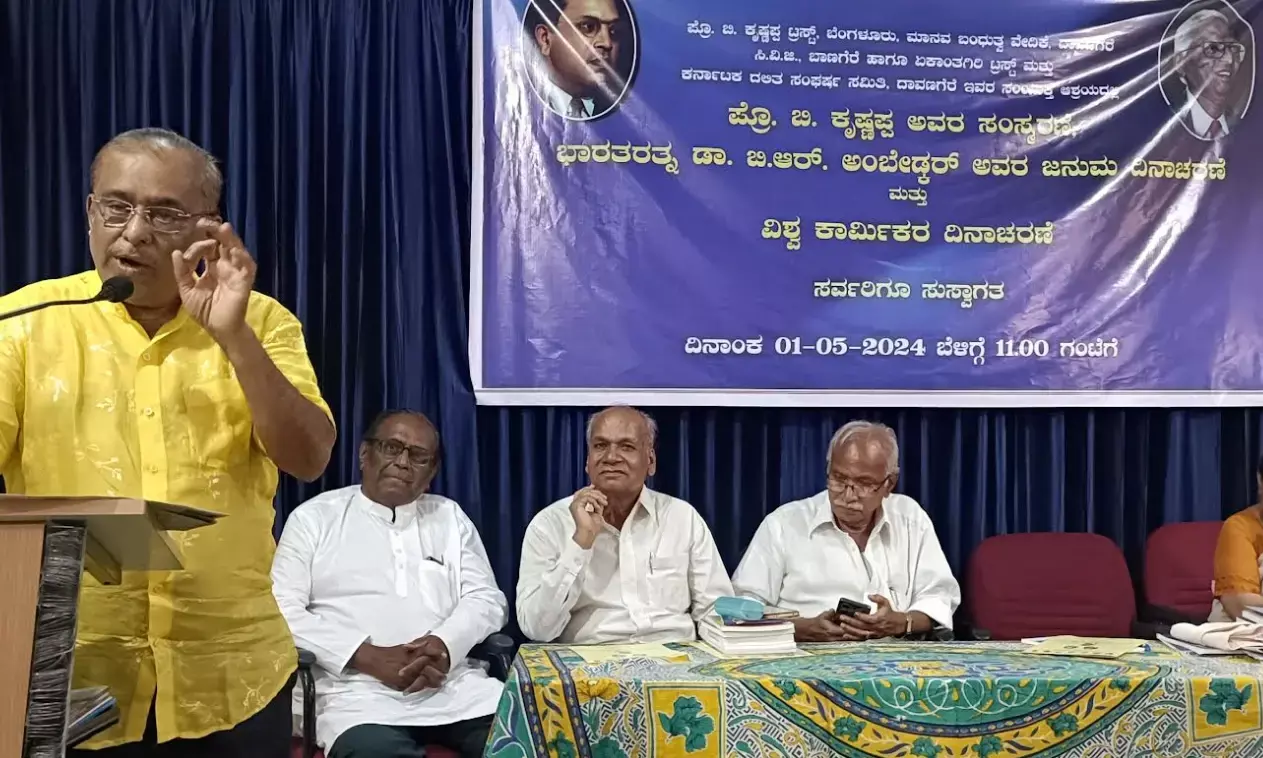 ನಗರದ ಹೊರವಲಯದ ಮೈತ್ರಿವನದಲ್ಲಿ ಪ್ರೊ.ಬಿ.ಕೃಷ್ಣಪ್ಪ ಟ್ರಸ್ಟ್, ಮಾನವ ಬಂಧುತ್ವ ವೇದಿಕೆ, ಸಿವಿಜಿ ಬಾಣಗೆರೆ, ಏಕಾಂತಗಿರಿ ಟ್ರಸ್ಟ್ ಮತ್ತು ಕರ್ನಾಟಕ ದಲಿತ ಸಂಘರ್ಷ ಸಮಿತಿಯಿಂದ ಆಯೋಜಿಸಿದ್ದ ಪ್ರೊ.ಬಿ.ಕೃಷ್ಣಪ್ಪ, ಡಾ.ಬಿ.ಆರ್.ಅಂಬೇಡ್ಕರ್ರವರ ಜನ್ಮ ದಿನ ಮತ್ತು ವಿಶ್ವ ಕಾರ್ಮಿಕ ದಿನಾಚರಣೆ ಉದ್ಘಾಟಿಸಿ ಅವರು ಮಾತನಾಡಿದರು.