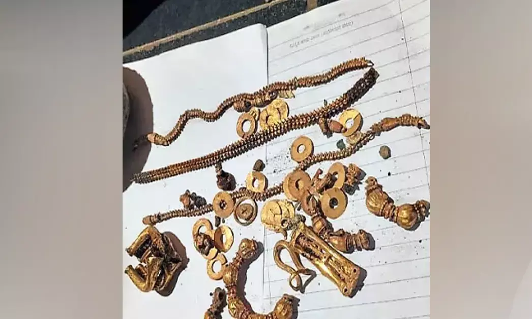 ಗದಗ : ಮನೆಯ ಹೊಸ ಅಡಿಪಾಯ ಅಗೆಯುವ ಸಂದರ್ಭದಲ್ಲಿ ಮಣ್ಣಿನ ಚೆಂಬೊಂದರಲ್ಲಿ ಅಂದಾಜು 1 ಕೆಜಿಯಷ್ಟು ತೂಕದ ಪುರಾತನ ಚಿನ್ನಾಭರಣಗಳು ಲಕ್ಕುಂಡಿ ಗ್ರಾಮದಲ್ಲಿ ಪತ್ತೆಯಾಗಿರುವುದಾಗಿ ವರದಿಯಾಗಿದೆ.
