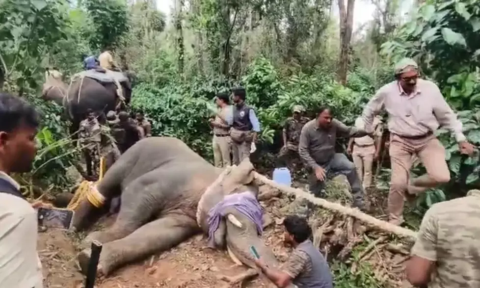 ಅರಣ್ಯ ಇಲಾಖೆಯು ಸಾಕಾನೆಗಳ ಮೂಲಕ ಕಾರ್ಯಾಚರಣೆ ನಡೆಸಿ ಕಾಡಾನೆಯನ್ನು ಸೆರೆಹಿಡಿದಿದೆ.