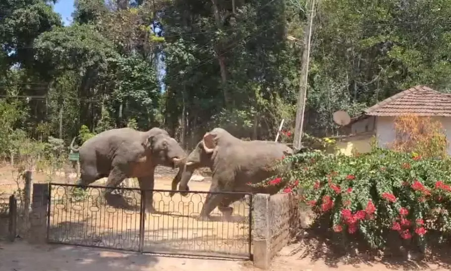 ಸೋಮವಾರ ಮಧ್ಯಾಹ್ನ ಸುಮಾರು 1 ರ ಹೊತ್ತಿಗೆ ಕಾಣಿಸಿಕೊಂಡ ಎರಡು ಕಾಡಾನೆಗಳು ಪರಸ್ಪರ ಕಾದಾಟಕ್ಕೆ ನಿಂತಿತ್ತು. ನಂತರ ಮನೆಯ ಮಾಲೀಕರು ಅರಣ್ಯ ಇಲಾಖೆಗೆ ಕರೆ ಮಾಡಿ ವಿಷಯ ತಿಳಿಸಿದ್ದರಿಂದ ತಕ್ಷಣ ಅರಣ್ಯ ಇಲಾಖೆ ಹಾಗೂ ಆನೆ ಕಾರ್ಯ ಪಡೆ ಸಿಬ್ಬಂದಿಗಳು ಆಗಮಿಸಿ ಸಾಹಸ ಪಟ್ಟು ಎರಡು ಕಾಡನೆಗಳ ಕಾದಾಟಕ್ಕೆ ಕಡಿವಾಣ ಹಾಕಿ ಎರಡು ಕಾಡಾನೆಗಳನ್ನು ಬೇರ್ಪಡಿಸಿ ಹಿಮ್ಮೆಟಿಸಿದ್ದಾರೆ.