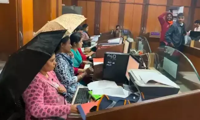 ಹಾವೇರಿ: ತಹಶೀಲ್ದಾರ್ ಕಚೇರಿಯ ಮೇಲ್ಛಾವಣಿ ಸೋರಿಕೆ; ಕೊಡೆ ಹಿಡಿದು ಕರ್ತವ್ಯ ನಿರ್ವಹಿಸುತ್ತಿರುವ ಸಿಬ್ಬಂದಿ