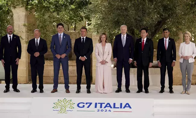 ಇಟಲಿಯಲ್ಲಿ ಗುರುವಾರ ಜಿ7 ಮುಖಂಡರ ಶೃಂಗಸಭೆಯಲ್ಲಿ (ಎಡದಿಂದ) ಯುರೋಪಿಯನ್ ಕೌನ್ಸಿಲ್ ಅಧ್ಯಕ್ಷ ಚಾಲ್ರ್ಸ್ ಮಿಚೆಲ್, ಜರ್ಮನ್ ಛಾನ್ಸಲರ್ ಒಲಾಫ್ ಶ್ಹಾಲ್ಝ್, ಕೆನಡಾದ ಪ್ರಧಾನಿ ಜಸ್ಟಿನ್ ಟ್ರೂಡೊ, ಫ್ರಾನ್ಸ್ ಅಧ್ಯಕ್ಷ ಇಮ್ಯಾನುವೆಲ್ ಮ್ಯಾಕ್ರೋನ್, ಇಟಲಿಯ ಪ್ರಧಾನಿ ಜಾರ್ಜಿಯಾ ಮೆಲೋನಿ, ಅಮೆರಿಕ ಅಧ್ಯಕ್ಷ ಜೋ ಬೈಡನ್, ಜಪಾನ್ ಪ್ರಧಾನಿ ಫುಮಿಯೊ ಕಿಷಿಡಾ, ಬ್ರಿಟನ್ ಪ್ರಧಾನಿ ರಿಷಿ ಸುನಾಕ್ ಮತ್ತು ಯುರೋಪಿಯನ್ ಕಮಿಷನ್ ಅಧ್ಯಕ್ಷೆ ಉರ್ಸುಲಾ ವಾನ್ಡರ್ ಲಿಯೆನ್ ಪಾಲ್ಗೊಂಡರು.