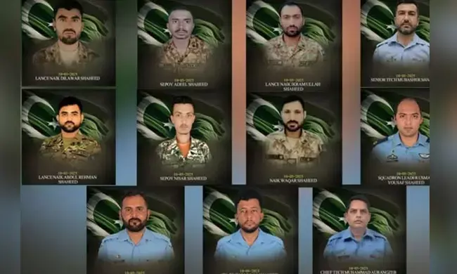 ಮಾತೃಭೂಮಿಯನ್ನು ರಕ್ಷಿಸುವಾಗ ಪಾಕಿಸ್ತಾನದ ಸಶಸ್ತ್ರ ಪಡೆಯ ಸ್ಕ್ವಾಡ್ರನ್ ಲೀಡರ್ ಉಸ್ಮಾನ್ ಯೂಸುಫ್, ಮುಖ್ಯ ತಂತ್ರಜ್ಞ ಔರಂಗಜೇಬ್, ಹಿರಿಯ ತಂತ್ರಜ್ಞ ನಜೀಬ್, ಫಾರೂಕ್, ಮುಬಾಶಿರ್, ಅಬ್ದುಲ್ ರೆಹಮಾನ್, ಲ್ಯಾನ್ಸ್ ನಾಯಕ್ ದಿಲಾವರ್ ಖಾನ್, ಲ್ಯಾನ್ಸ್ ನಾಯಕ್ ಇಕ್ರಮುಲ್ಲಾ, ವಕಾರ್ ಖಾಲಿದ್, ಮುಹಮ್ಮದ್ ಅದೀಲ್ ಅಕ್ಬರ್ ಮತ್ತು ನಿಸಾರ್ ಮೃತಪಟ್ಟಿದ್ದಾರೆ. 78 ಜನರು ಗಾಯಗೊಂಡಿದ್ದಾರೆ ಎಂದು ಪಾಕಿಸ್ತಾನ ಸೇನೆ ತಿಳಿಸಿದೆ.