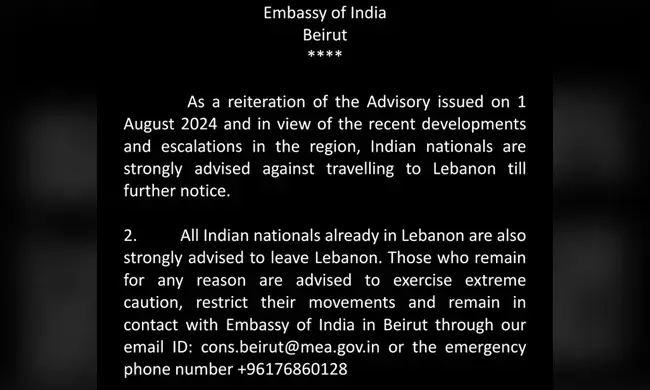 ಅಲ್ಲದೆ ಲೆಬನಾನ್ಗೆ ಪ್ರಯಾಣಿಸದಂತೆ ಭಾರತೀಯ ಪ್ರಜೆಗಳಿಗೆ ಎಚ್ಚರಿಕೆ ನೀಡಲಾಗಿದೆ. ಲೆಬನಾನ್ನಲ್ಲಿಯೇ ಅನಿವಾರ್ಯವಾಗಿ ಉಳಿದುಕೊಳ್ಳುವ ಸಂದರ್ಭ ಬಂದರೆ ಗರಿಷ್ಟ ಎಚ್ಚರ ವಹಿಸುವಂತೆ ಮತ್ತು ಬೈರೂತ್ನಲ್ಲಿರುವ ಭಾರತೀಯ ದೂತಾವಾಸದ ಜತೆ ನಿರಂತರ ಸಂಪರ್ಕದಲ್ಲಿ ಇರುವಂತೆ ಭಾರತೀಯರಿಗೆ ಸಲಹೆ ನೀಡಲಾಗಿದೆ.