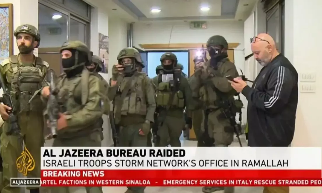 ಭಾರೀ ಶಸ್ತ್ರಸಜ್ಜಿತರಾಗಿದ್ದ ಇಸ್ರೇಲ್ ಸೈನಿಕರು ವೆಸ್ಟ್ ಬ್ಯಾಂಕ್ ನಗರವಾದ ರಮಲ್ಲಾದಲ್ಲಿ ಅಲ್ ಜಝೀರಾ ಬ್ಯೂರೋ ಮೇಲೆ ದಾಳಿ ನಡೆಸಿದ್ದಾರೆ. ಇಸ್ರೇಲ್ ಪಡೆಗಳು ಚಾನೆಲ್ನ ಕಚೇರಿಗೆ ನುಗ್ಗಿ ಕಾರ್ಯಕ್ರಮ ಪ್ರಸಾರವನ್ನು ನಿಲ್ಲಿಸುವಂತೆ ಸಿಬ್ಬಂದಿಗೆ ಆದೇಶದ ಪ್ರತಿಯನ್ನು ನೀಡುವ ದೃಶ್ಯವನ್ನು ಕತಾರ್ ಮೂಲದ ಅಲ್ ಜಝೀರಾ ವಾಹಿನಿ ವರದಿ ಮಾಡಿದೆ.
