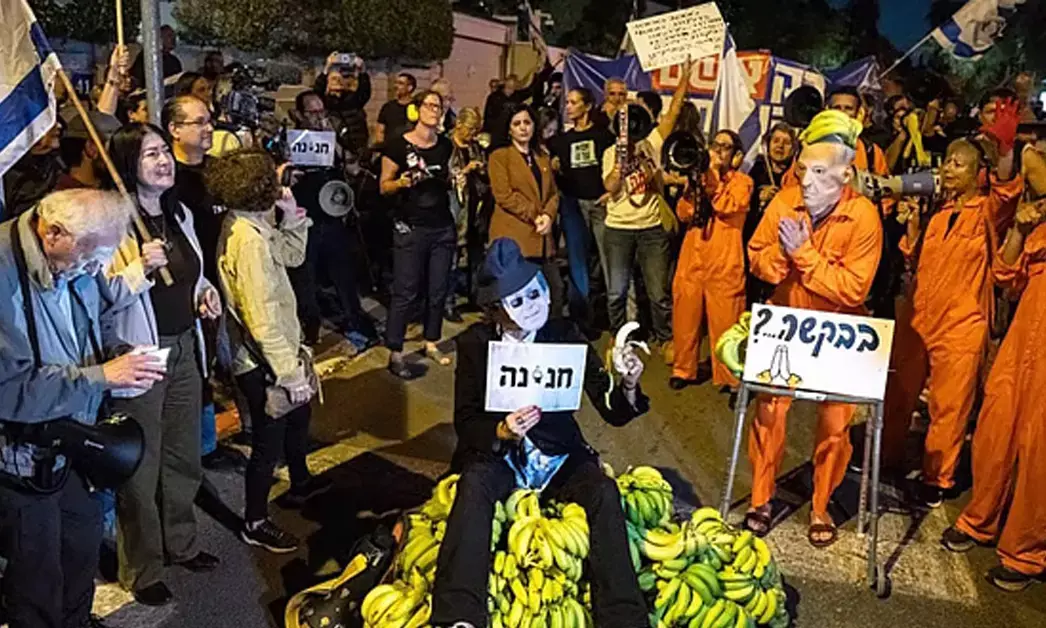 ದೀರ್ಘಾವಧಿಯಿಂದ ನಡೆಯುತ್ತಿರುವ ಭ್ರಷ್ಟಾಚಾರ ಪ್ರಕರಣದ ವಿಚಾರಣೆಯಲ್ಲಿ ತನಗೆ ಕ್ಷಮಾದಾನ ನೀಡಬೇಕೆಂದು ರವಿವಾರ ನೆತನ್ಯಾಹು ಅಧ್ಯಕ್ಷರಿಗೆ ಅಧಿಕೃತ ಕೋರಿಕೆ ಸಲ್ಲಿಸಿದ್ದರು. ಆದರೆ ತಪ್ಪೊಪ್ಪಿಕೊಳ್ಳದೆ ಮತ್ತು ಪಶ್ಚಾತ್ತಾಪ ವ್ಯಕ್ತಪಡಿಸದೆ ಕ್ಷಮಾದಾನ ಕೋರುವುದನ್ನು ವಿರೋಧಿಸಿ ` ಕ್ಷಮೆ ಅಂದರೆ ಬನಾನಾ ರಿಪಬ್ಲಿಕ್' ಎಂಬ ಬ್ಯಾನರ್ನಡಿ ಪ್ರತಿಭಟನೆ ನಡೆಸಲಾಗಿದೆ. ಕೆಲವು ಪ್ರತಿಭಟನಾಕಾರರು ನೆತನ್ಯಾಹು ಅವರನ್ನು ಹೋಲುವ ಮುಖವಾಡ ಮತ್ತು ಜೈಲಿನ ಸಮವಸ್ತ್ರ ಧರಿಸಿದ್ದರೆ, ಇನ್ನು ಕೆಲವರು ಬಾಳೆಹಣ್ಣುಗಳ ರಾಶಿಯ ಹಿಂದೆ `ಕ್ಷಮೆ' ಎಂಬ ಫಲಕ ಹಿಡಿದು ನಿಂತಿದ್ದರು.