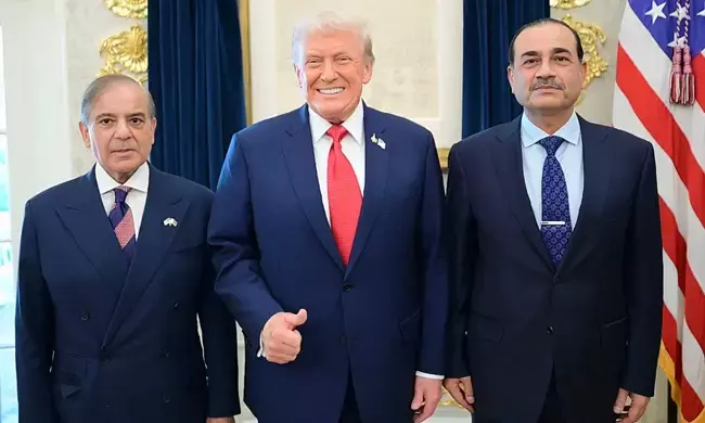ವಾಷಿಂಗ್ಟನ್: ಅಮೆರಿಕ ಅಧ್ಯಕ್ಷ ಡೊನಾಲ್ಡ್ ಟ್ರಂಪ್ ಅವರು ಗುರುವಾರ ಪಾಕಿಸ್ತಾನದ ಪ್ರಧಾನಿ ಶೆಹಬಾಝ್ ಶರೀಫ್ ಹಾಗೂ ಸೇನಾ ಮುಖ್ಯಸ್ಥ ಅಸೀಂ ಮುನೀರ್ ಅವರನ್ನು ಓವಲ್ ಕಚೇರಿಯಲ್ಲಿ ಭೇಟಿ ಮಾಡಿ ಮಾತುಕತೆ ನಡೆಸಿದರು. ಭೇಟಿಗೆ ಮುನ್ನ ಉಭಯ ನಾಯಕರನ್ನು "ಸರ್ವಶ್ರೇಷ್ಠ ನಾಯಕರು" ಎಂದು ಗುಣಗಾನ ಮಾಡಿದರು.