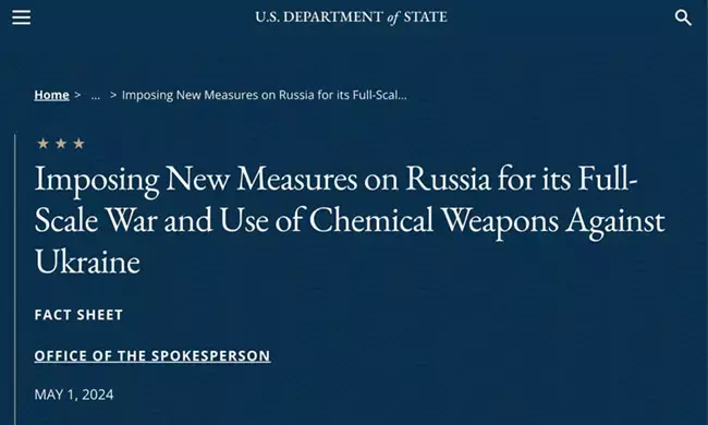 ವಾಷಿಂಗ್ಟನ್: ರಾಸಾಯನಿಕ ಶಸ್ತ್ರಾಸ್ತ್ರಗಳ ಸಮಾವೇಶವನ್ನು ಉಲ್ಲಂಘಿಸಿ ರಶ್ಯವು ಉಕ್ರೇನ್ ಪಡೆಗಳ ವಿರುದ್ಧ ರಾಸಾಯನಿಕ ಅಸ್ತ್ರಗಳನ್ನು ಬಳಸಿದೆ ಎಂದು ಅಮೆರಿಕದ ವಿದೇಶಾಂಗ ಇಲಾಖೆ ಆರೋಪಿಸಿದ್ದು ರಶ್ಯದ ವಿರುದ್ಧ ಹೊಸ ನಿರ್ಬಂಧಗಳನ್ನು ಘೋಷಿಸಿದೆ.