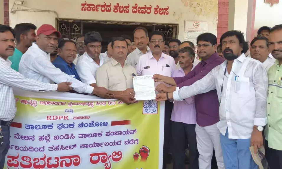 ಕಲಬುರಗಿ : ಚಿಂಚೋಳಿ ತಾಲೂಕಿನ ಶಾದಿಪೂರ ಗ್ರಾಮ ಪಂಚಾಯತ್ ಅಭಿವೃದ್ಧಿ ಅಧಿಕಾರಿ ಶ್ರೀಧರ ಜವರೇಗೌಡ ಮೇಲೆ ಹಲ್ಲೆ ಮಾಡಿದ ಆರೋಪಿಯನ್ನು ಬಂಧಿಸಿ, ಸೂಕ್ತ ಕ್ರಮ ಕೈಗೊಳ್ಳು ಬೇಕು ಎಂದು ಚಿಂಚೋಳಿ ಸರಕಾರಿ ನೌಕರರ ಸಂಘ ಪ್ರತಿಭಟನೆ ಮುಖಾಂತರ ತೆರಳಿ ತಹಶೀಲ್ದಾರ್ ಅವರಿಗೆ ಮನವಿ ಪತ್ರ ಸಲ್ಲಿಸಿದರು.